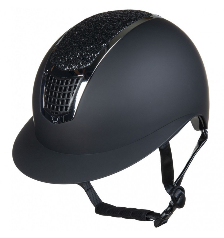 Kask do jazdy konny stworzony dla miłośników błysku. Modny i elegancki kask z szerokim daszkiem i matową kopułą, która została ozdobiona brokatem. Wyposażony w otwory wentylacyjne. Wewnętrzna wkładka jest odpinana. Kask można idealnie dopasować za pomocą pokrętła regulacyjnego z tyłu głowy. Spełnia normy vg1.01.040 2014-12