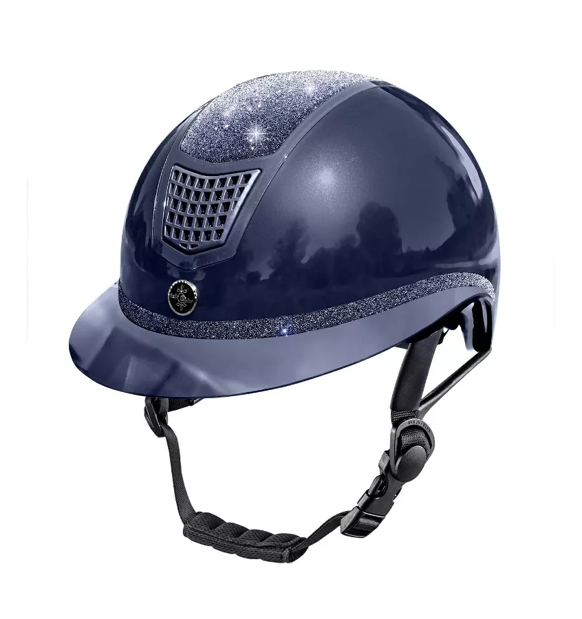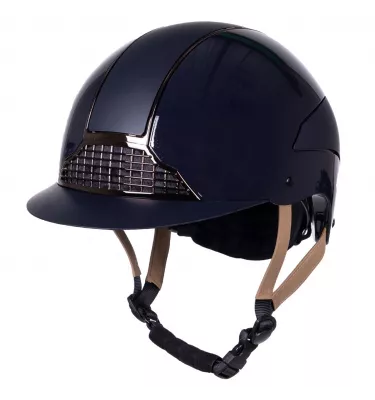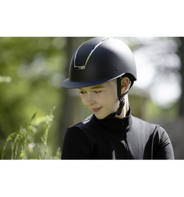 Nowoczesny, modnie wykończony kask jeździecki. Daszek oraz pokrywa kasku są lakierowane na wysoki połysk. Bardzo wygodny, dzięki odpinanej wkładce z pianki memory. Wyposażony w pokrętło regulacji dopasowującej kask do obwodu głowy. Posiada 3-punktowy system regulacji pasków. Efektywny system wentylacji (otwory wentylacyjne z przodu i z tyłu). Elastyczny daszek. Wykonany z materiału o wysokim stopniu absorpcji uderzeń i wstrząsów, wspomaganego w tym dodatkowo przez opatentowane zastosowanie półkul absorpcyjnych w górnej części skorupy kasku. Posiada wzmocnienie przeciw naprężeniom przy bocznej deformacji