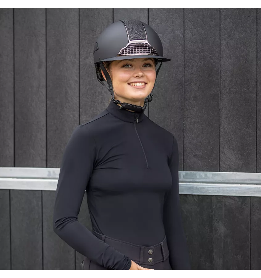 Przykuwający wzrok, lekki kask jeździecki Detroit z matową powłoką zewnętrzną i nadrukiem. Wyposażony w szeroki daszek, który sprawią, że jazda w słoneczne dni jest bardzoej komfortowa. Wyposażony w regulowany pasek pod brodą z miękką wyściółką. Kask posiada pokrętło regulacyjne, które pozwala na optymalne dopasowanie kasku. Podszewka wewnętrzna wykonana jest z materiału coolmesh, który pochłania wilgoć i szybko schnie. Podszewka nadaje się do prania ręcznego i można ją łatwo przymocować do kasku za pomocą systemu zatrzaskowego. Kask Detroit posiada liczne otwory wentylacyje.