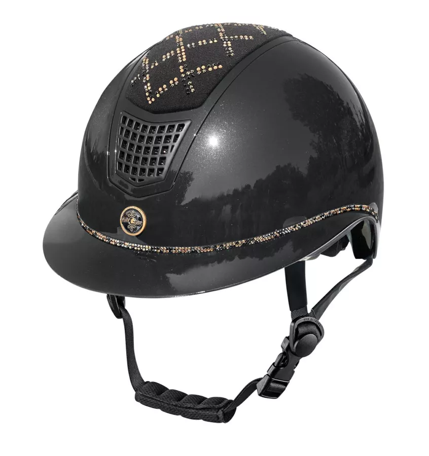Nowoczesny, modnie wykończony kask jeździecki. Daszek oraz pokrywa kasku są są lakierowane na wysoki połysk. Bardzo wygodny dzięki wkładce z pianki memory, którą można wypiąć i wyprać. Wposażony w pokrętło regulacji dopasowującej kask do obwodu głowy oraz 3-punktowy system regulacji pasków. Efektywny system wentylacji (otwory wentylacyjne z przodu i z tyłu). Wykonany z materiału o wysokim stopniu absorpcji uderzeń i wstrząsów, wspomaganego w tym dodatkowo przez opatentowane zastosowanie półkul absorpcyjnych w górnej części skorupy kasku. Posiada wzmocnienie przeciw naprężeniom przy bocznej deformacji