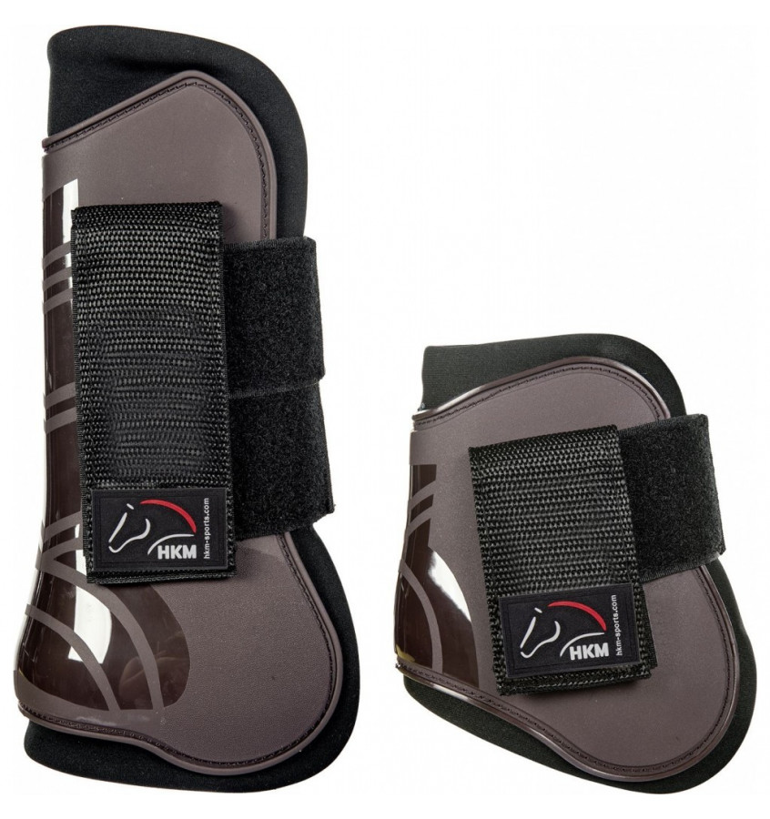 Komplet ochraniaczy z twardą skorupą, która dobrze chroni nogi konia podczas treningu. Miękko podszyte od wewnątrz.