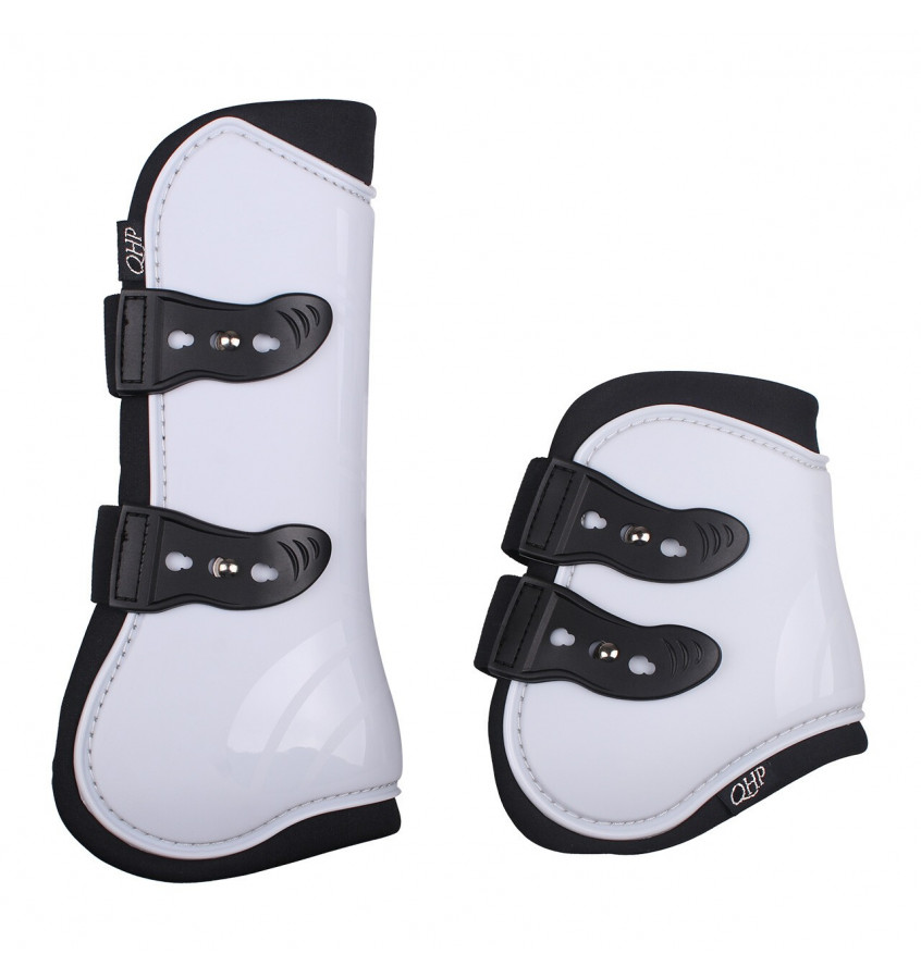 Komplet ochraniaczy skokowych dla konia. Solidnie wykonane. Mocna skorupa, która chroni ścięgna wykonana z tworzywa sztucznego. Wyściełane miękkim neoprenem, który przepuszcza powietrze. Praktyczne zapięcie na kołki. Anatomiczny kształt, dopsowany do nogi konia.