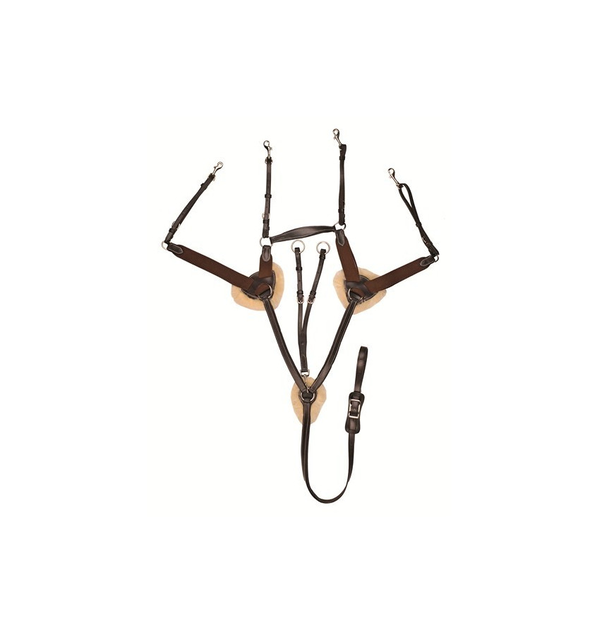 Napierśnik pięcioramienny wykonany z wysokogatunkowej skóry. Zapewnia stabilne utrzymanie siodła podczas skoków i nie tylko. W miejscach narażoną na obtarcia znajduje się naturalna owcza wełna, którą można odpiąć. Napierśnik posiada eleganckie białe przeszycia, odpinany wytok, elastyczne wstawki oraz cztery karabińczyki.
