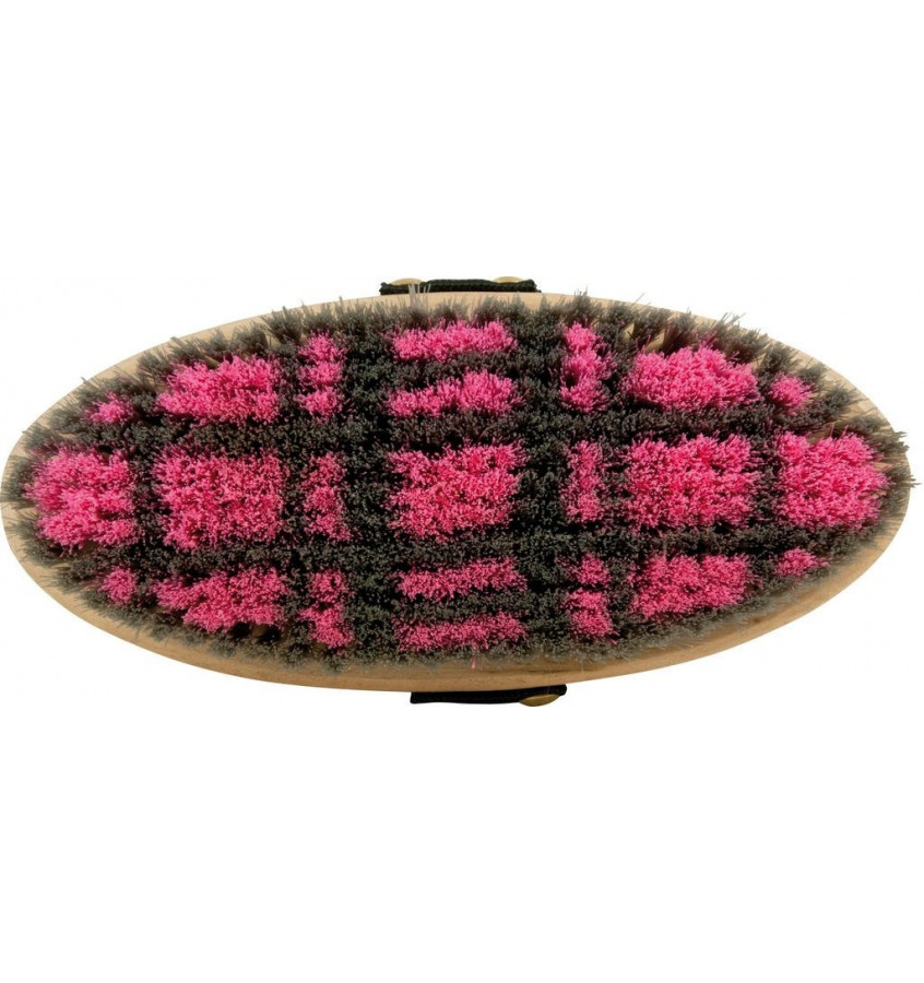 Dwukolorowa szczotka do czyszczenia koni. Wykonana z drewna i syntetycznego włosia. Wielkość: 19 cm