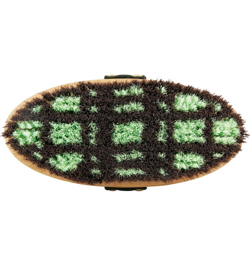 Dwukolorowa szczotka do czyszczenia koni. Wykonana z drewna i syntetycznego włosia. Wielkość: 19 cm