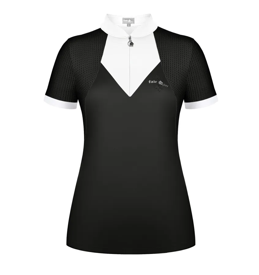 Funkcyjna koszula konkursowa z krótkim rękawem, zaprojektowana z myślą o komforcie i eleganckim wyglądzie podczas zawodów jeździeckich. Idealnie łączy sportową wygodę z klasycznym stylem, dzięki czemu doskonale sprawdzi się na parkurze i czworoboku.
