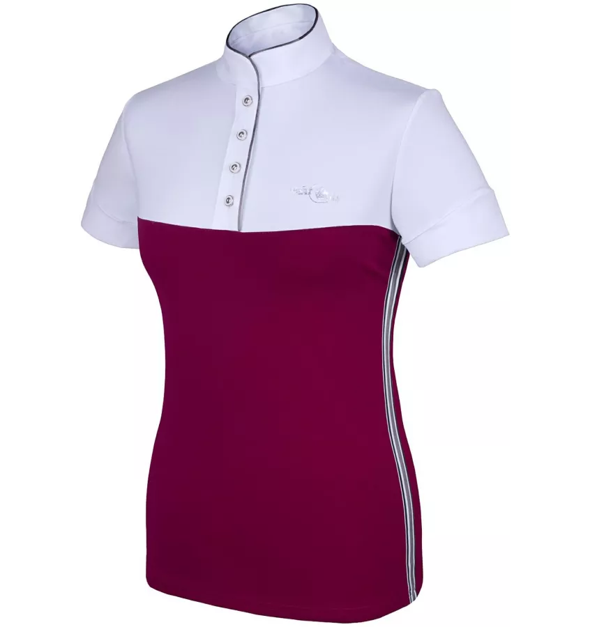 Koszulka konkursowa z krótkim rękawem wykonana z elastycznej, oddychającej dzianiny technicznej. Stójka w kołnierzyku wykończona szarym pipingiem. Po bokach ozdobiona trójkolorowym lampasem, co dodaje jej sportowego i nowoczesnego charakteru. Stójka w kołnierzyku wykończona szarym pipingiem.