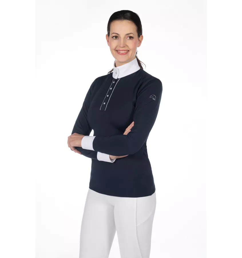 Koszula konkursowa jeździecka z długim rękawem. Wykonana z materiału oddychającego. Elastyczny materiał nie krępuje ruchów. Podszyta drapanym materiałem, który zapewnia optymalne ciepło. Taliowany krój. Ozdobne zatrzaski z brokatową lamówką na plisie guzikowej.