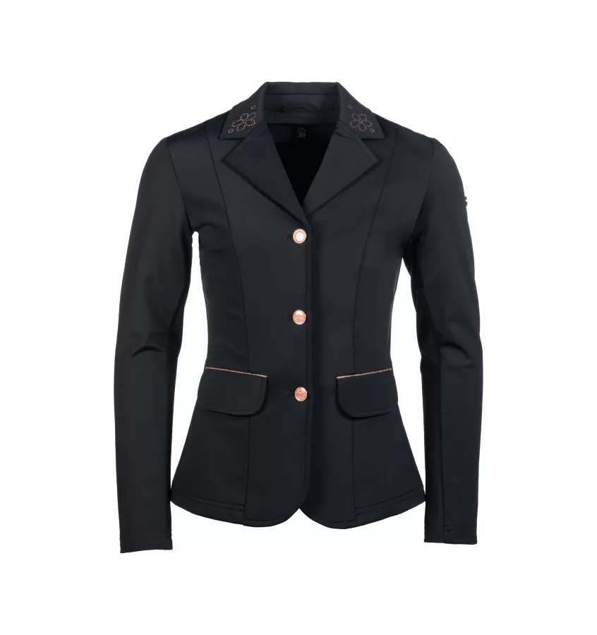 Elegancki frak konkursowy dla młodych jeźdźców. Wykonany z materiałów odpornych na zagniecenia i zabrudzenia. Z tyłu oraz na kołnierzyku ozdobiony kryształkami. Marynarka posiada 2 kieszenie. Zapinana jest naa suwak oraz guziki.