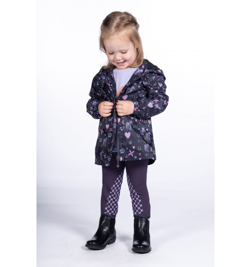 Dziecięca kurtka przeciwdeszczowa z akcentami jeździeckimi. Wykonana z lekkiego, oddychającego materiału, który jest wodoodporny i odrzucający brud. Zapinana na zamek. Wyposażona w kaptur oraz ściągacze w rękawkach. Dwie kieszonki z przodu.