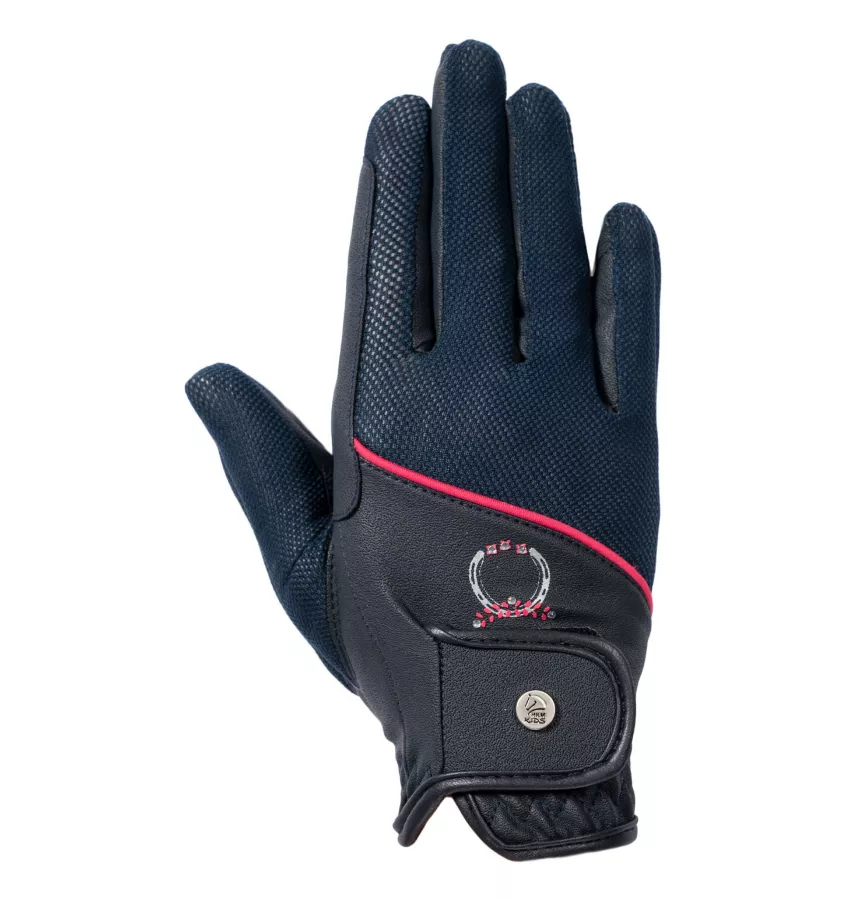 Rękawiczki do jazdy konnej zaprojektowane z myślą o młodych jeźdźcach. Na grzbiecie dłoni znajduje się wstawka z siateczki, która zapewnia dobrą cyrkulację powietrza. Zdobione nadrukiem oraz drobnymi kryształkami.