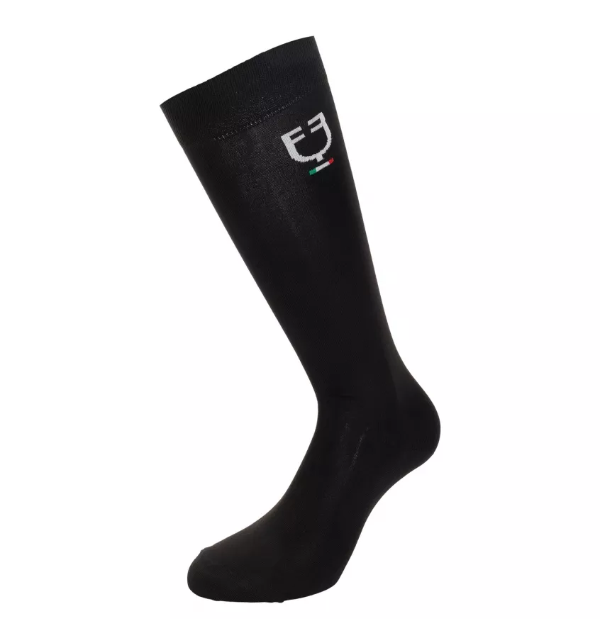 Skarpetki z lekkiego, oddychającego i wygodnego, rozciągliwego materiału technicznego. Zastosowana tkanina jest odporna na ścieranie i przecieranie. U góry logo Equestro z włoską flagą. Znakomite zarówno na zawody, jak i w czasie wolnym.