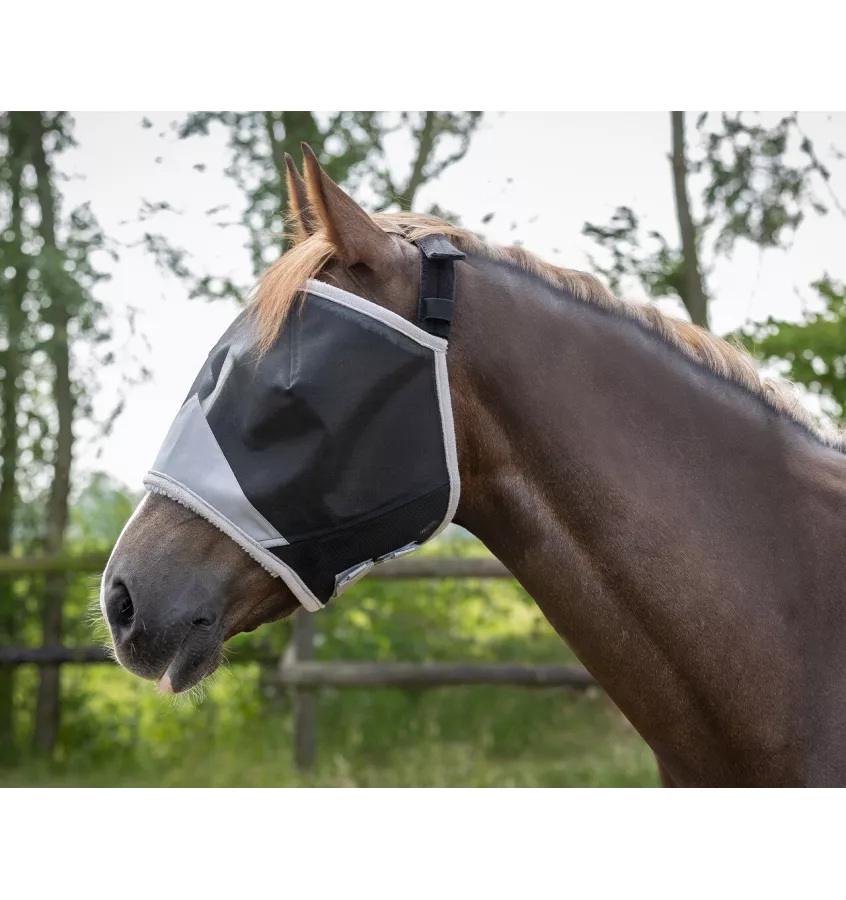 Maska chroniąca przed owadami polecana dla koni wrażliwych na słońce. Chroni przed promieniowaniem UV. Wykonana z mocnej siateczki i oddychającego materiału. Maska bez ochrony uszu i nozdrzy.