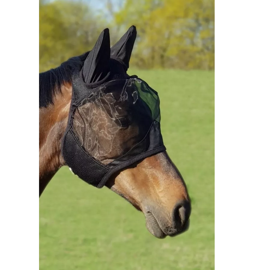 Maska chroniąca oczy i uszy konia przed uciążliwymi owadami. Jej przewiewny materiał pozwala skórze oddychać nawet w upalne dni. W miejscach, które mają kontakt ze skórą zastosowano miękkie podszycie, które zapobiega obtarciom.