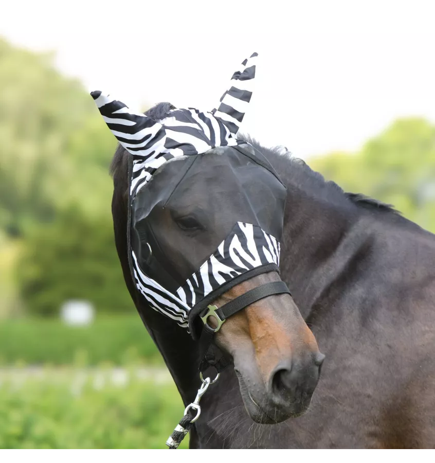 Maska ze wzorem zebry doskonale ochroni głowę konia przed uciążliwymi owadami. Jej usztywniana siatka została uszyta w taki sposób, że nie dotyka oczu konia.