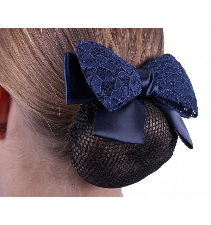 Siateczka do podtrzymania włosów ozdobiona podwójną kokardką, górna wykonana z koronki natomiast dolna z satyny. Idealnie sprawdzi się podczas zawodów, aby elegancko upiąć włosy. Zapinana na klamrę wsuwaną.
