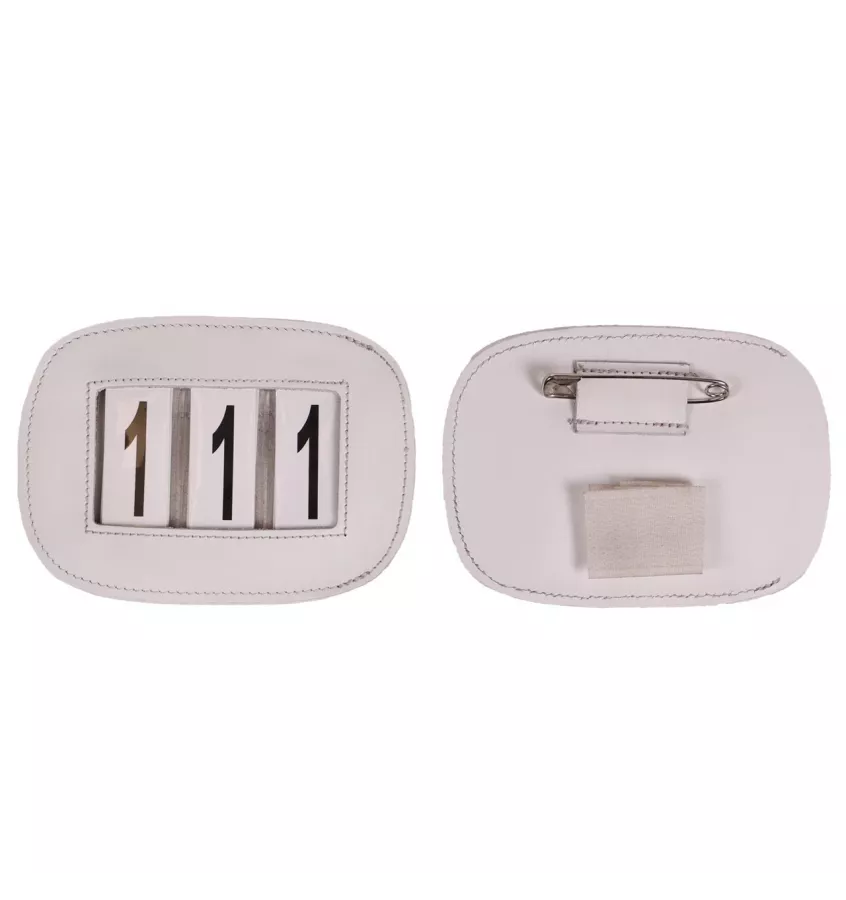 Prostokątny uchwyt na numerek startowy Modeste. Wyposażony w agrafkę oraz rzep, dzięki czemu można go łatwo przymocować do ogłowia, czapraka lub napierśnika. Wykonany ze skóry.