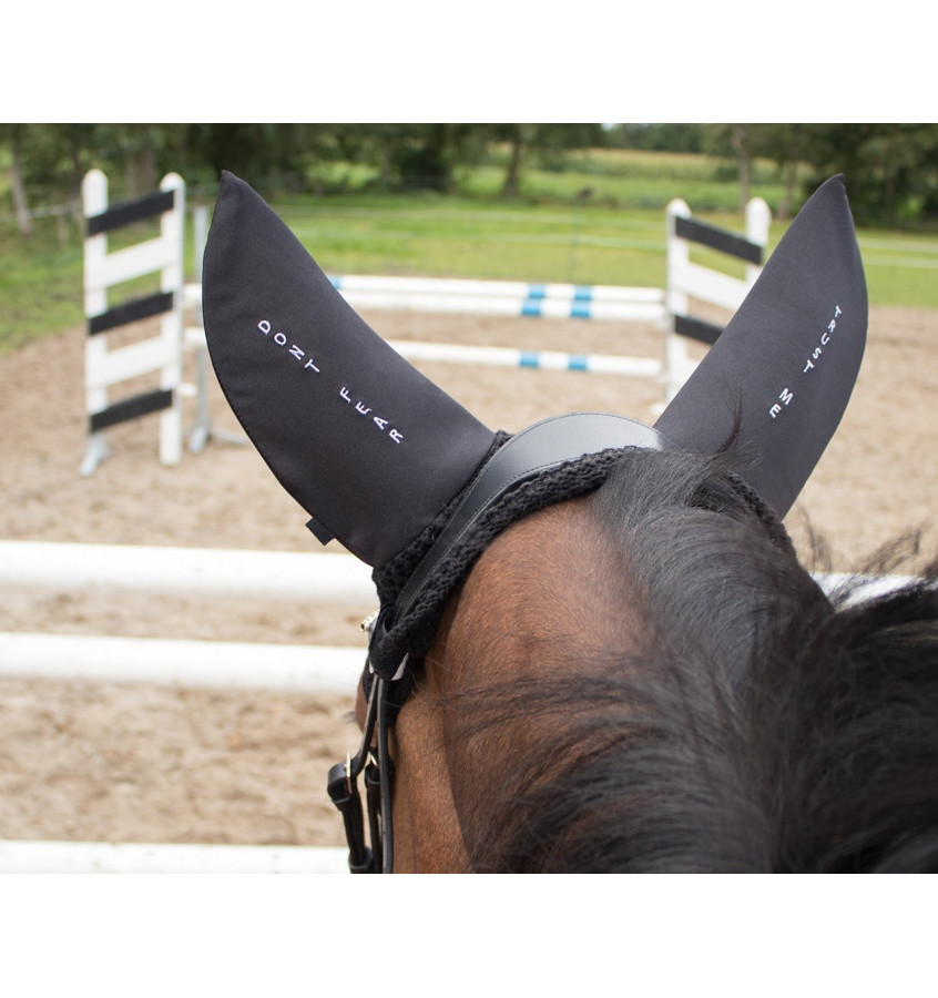 Nauszniki wyciszające wykonane z wysokiej jakości materiałów. Uszy dodatkowo wypełnione poliestrem dzięki czemu tłumią hałas. Co poprawia koncentrację konia np.: podczas zawodów czy nawet w trakcie golenia. Nauszniki posiadają ciekawy napis, który jeździec widzi z siodła.