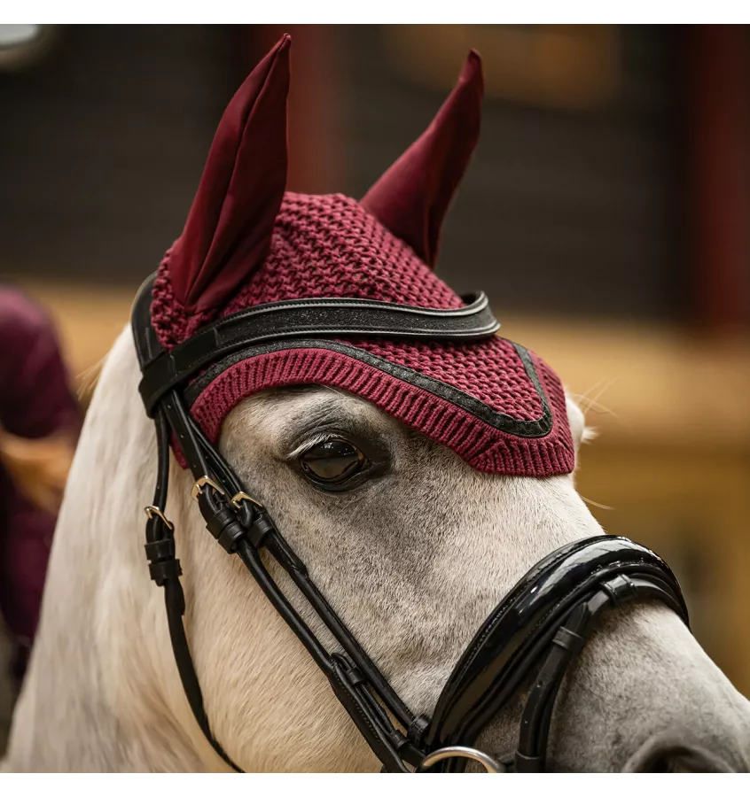 Szydełkowane nauszniki dla konia. Posiada elastyczne uszy dla większego komfortu oraz brokatowe wykończenie, które dodaje elegancji. Kolekcja jesień/zima 2025/2026