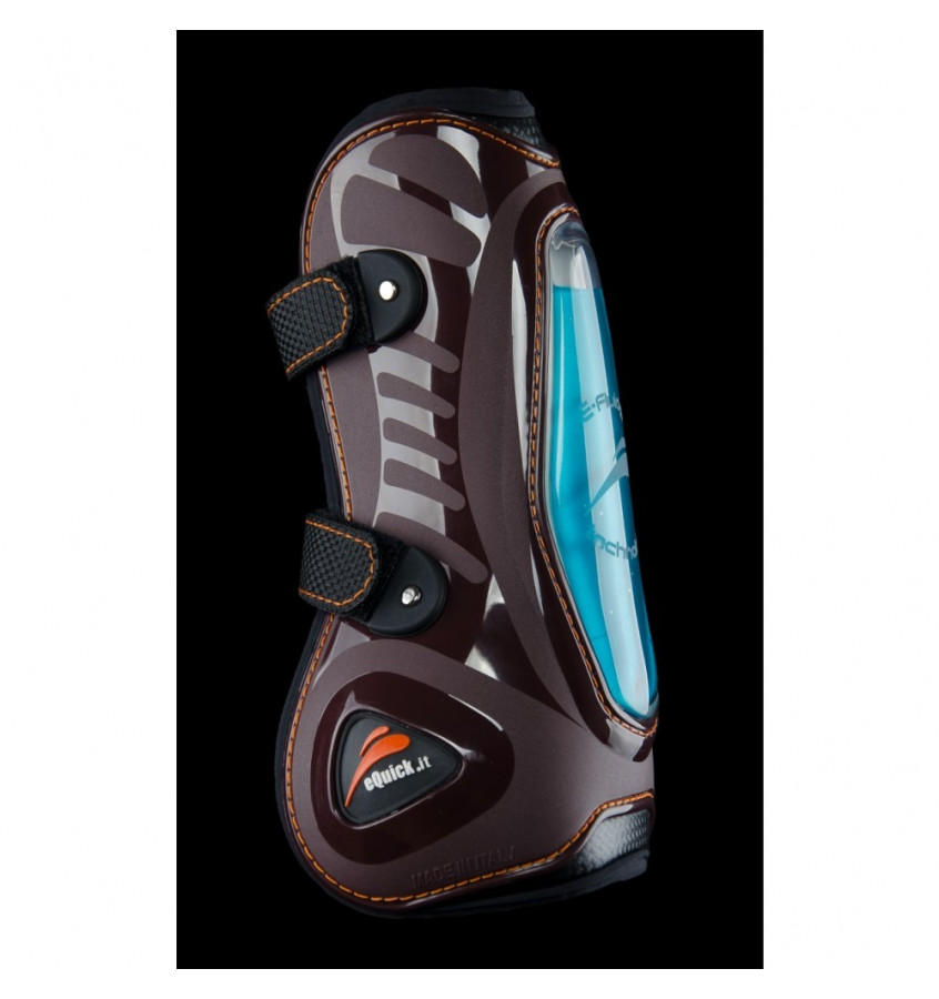 Ochraniacze firmy Equick. Polecane przez wielu zawodników. Najwyższej, jakości ochraniacze z systemem eFluidgel. Wykonane z najwyższej, jakości materiałów, cechujących się trwałością i niezawodnością. Ukształtowane anatomicznie by chronić ścięgna przed urazami. Zapewniając jednocześnie najwyższy komfort dla końskich nóg. Zewnętrzna powłoka wzmocniona TPU. W środku wyściełane miękkim neoprenem, zakończonym zmywalna krawędź z Lycry zapobiegająca powstawaniu ran. Zapinane na rzepy, co zapewnia łatwą regulację. Technologia eFluidgel to nic innego jak specjalny bąbelek w powłoce zmniejszający siłę uderzenia końskich nóg. Jest to możliwe dzięki kompresji powietrza i żelu powodującymi amortyzację wstrząsów. Dodatkowo posiadają system skrętny zapobiegający blokowaniu się kończyn podczas skoku.