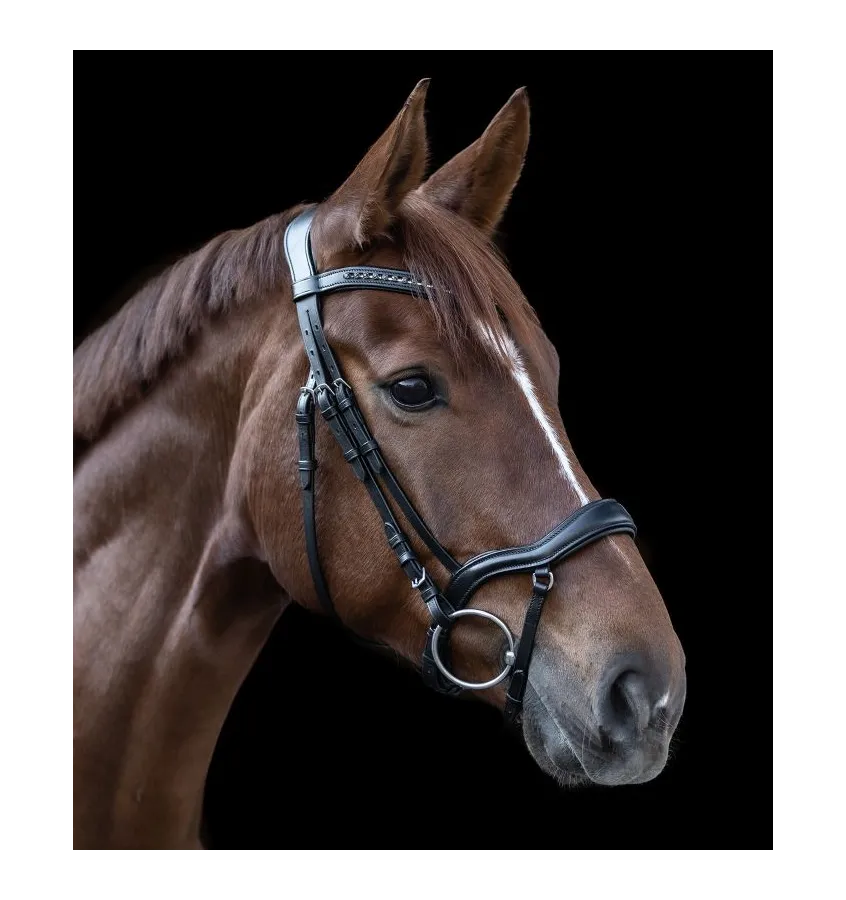 Ogłowie Waldhausen z anatomicznie wyprofilowanym nachrapnikiem. Pasek krzyżowy został cofnięty, co zapobiega wywieraniu nacisku na chrapy. Ogłowie posiada anatimicznie wyprofilowany pasek potyliczny, który gwarantuje lepsze rozłożenie nacisku. Subtelnie zakrzywiony naczółek pięknie zdobi i dodatkowo rozświetla głowę konia. Ogłowie w newralgicznych miejscach jest miękko wyściełane, aby zapewnić koniowi maksymalny komfort. Okucia ze stali nierdzewnej. W zestawie wodze parciane 19mm.