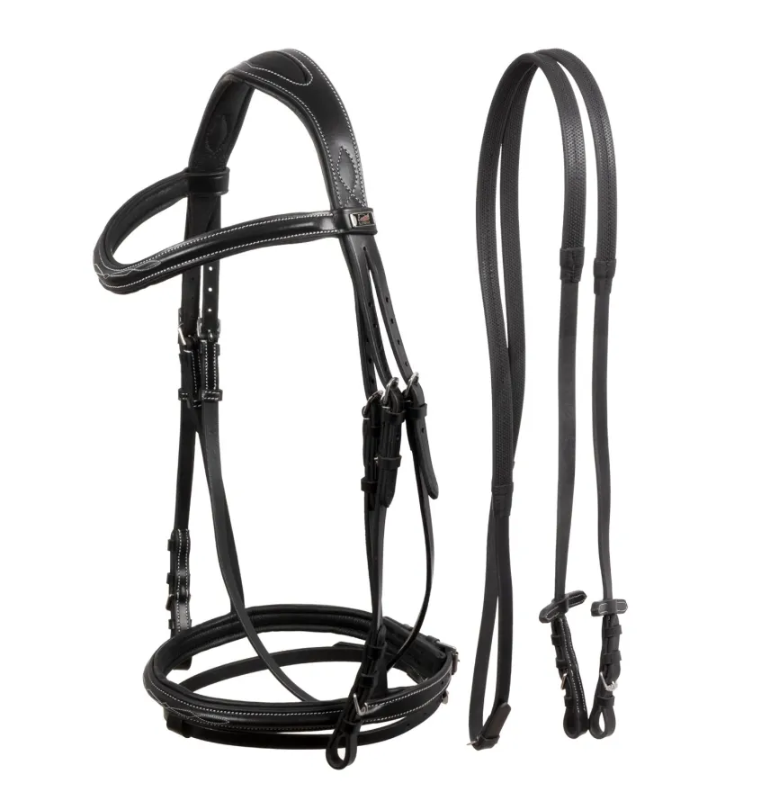 Skórzane ogłowie z nachrapnikiem angielskim i białymi przeszyciami. W komplecie z gumowymi wodzami.