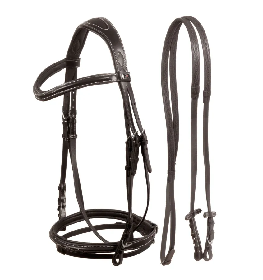 Skórzane ogłowie z nachrapnikiem angielskim i białymi przeszyciami. W komplecie z gumowymi wodzami.