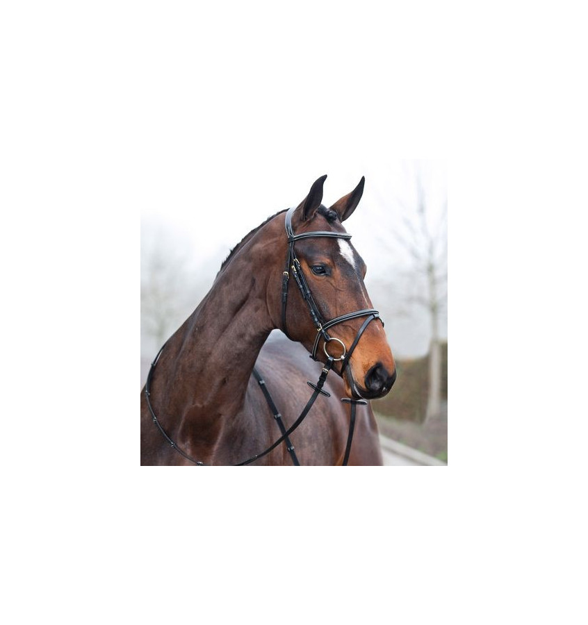 Bardzo eleganckie ogłowie. Wykonane z wysokogatunkowej skóry. Ogłowie posiada nachrapnik kombinowany, cofnięty nagłówek, który jest dodatkowo podszyty miękką skórą. Ogłowie przeszyte jest białymi nićmi, które nadają wyjątkowego wyglądu, dodatkowe zdobienia znajdują się na nachrapniku i naczółku. Ogłowie sprzedawane jest w komplecie z wodzami parcianymi.