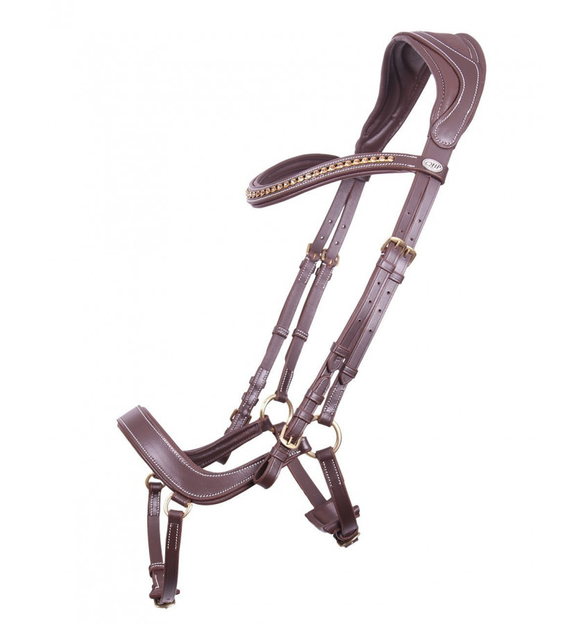 Ogłowie Devi wykonane z wysokiej jakości skóry. Anatomiczne ukształtowanie maksymalnie rozkłada nacisk na głowę u wrażliwych koni. Specjalnie ukształtowany pasek na nos zapewnia swobodę kości policzkowej. Naczółek ozdobiony delikatnymi diamencikami. Dodatkowe podszycie w części potylicznej i nosowej. Ozdobione białymi przeszyciami. Okucia w kolorze złotym. W zestawie wodze parciane.