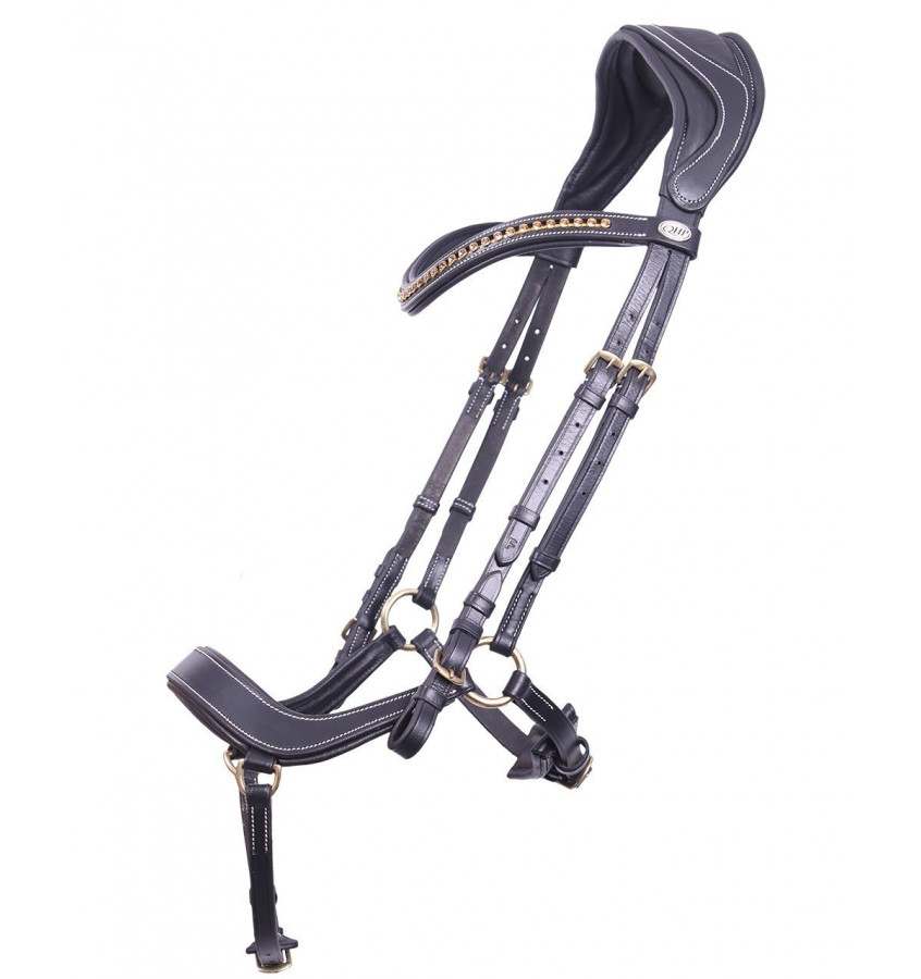 Ogłowie Devi wykonane z wysokiej jakości skóry. Anatomiczne ukształtowanie maksymalnie rozkłada nacisk na głowę u wrażliwych koni. Specjalnie ukształtowany pasek na nos zapewnia swobodę kości policzkowej. Naczółek ozdobiony delikatnymi diamencikami. Dodatkowe podszycie w części potylicznej i nosowej. Ozdobione białymi przeszyciami. Okucia w kolorze złotym. W zestawie wodze parciane.