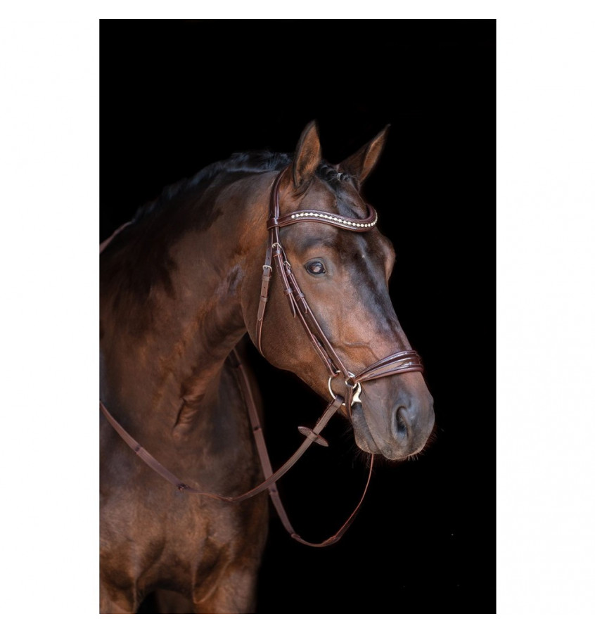 Ogłowie wykonane z najwyższej jakości skóry bydlęcej. Miękko podszyte nie sprawia dyskomfortu. Lakierowany naczółek oraz nachrapnik hanowerski. Naczółek dodatkowo został ozdobiony syntetycznymi diamencikami.