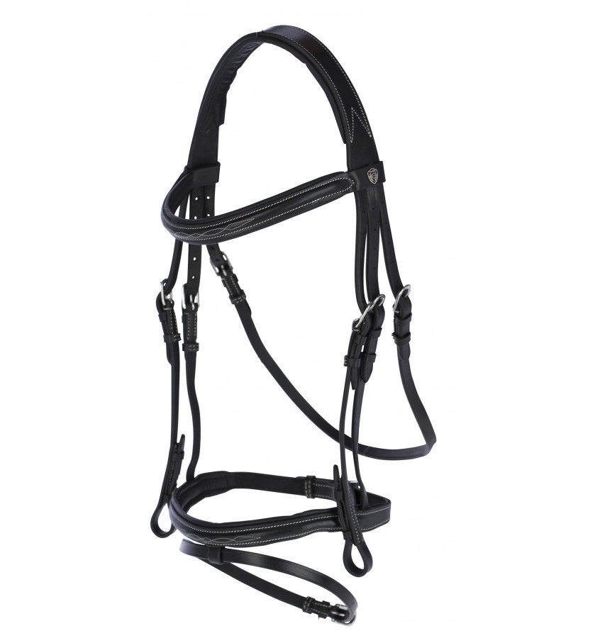 Ogłowie klasyczne wykonane z najwyższej jakości skóry. Białe ozdobne przeszycia zapewniają elegancki wygląd. Miękko podszyte w miejscach wrażliwych na końskiej głowie. W komplecie z wodzami parcianymi.