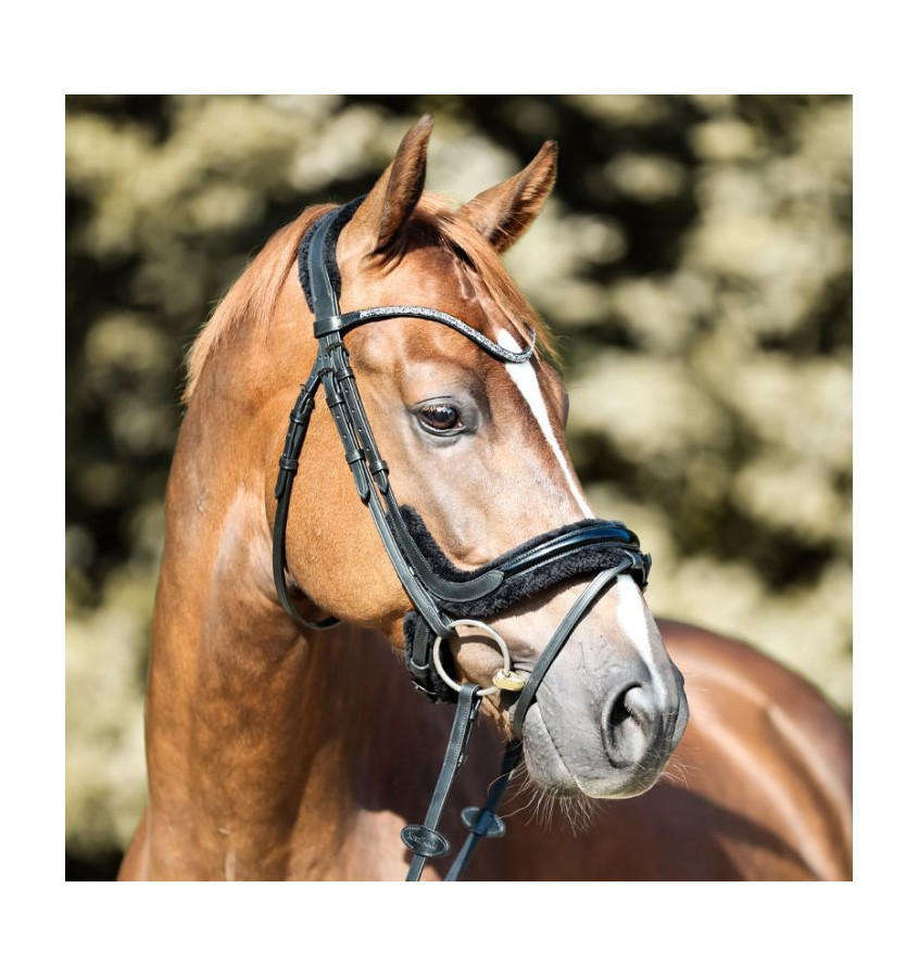 Ogłowie wykonane z najlepszej jakości miękkiej skóry. Anatomiczny kształt zapewnia maksymalną wygodę konia. Nachrapnik kombinowany lakierowany. Naczółek został ozdobiony brokatem. Podszyte w trzech miejscach futerkiem zapinanym na rzepy. W zestawie wodze gumowe ze stoperami.