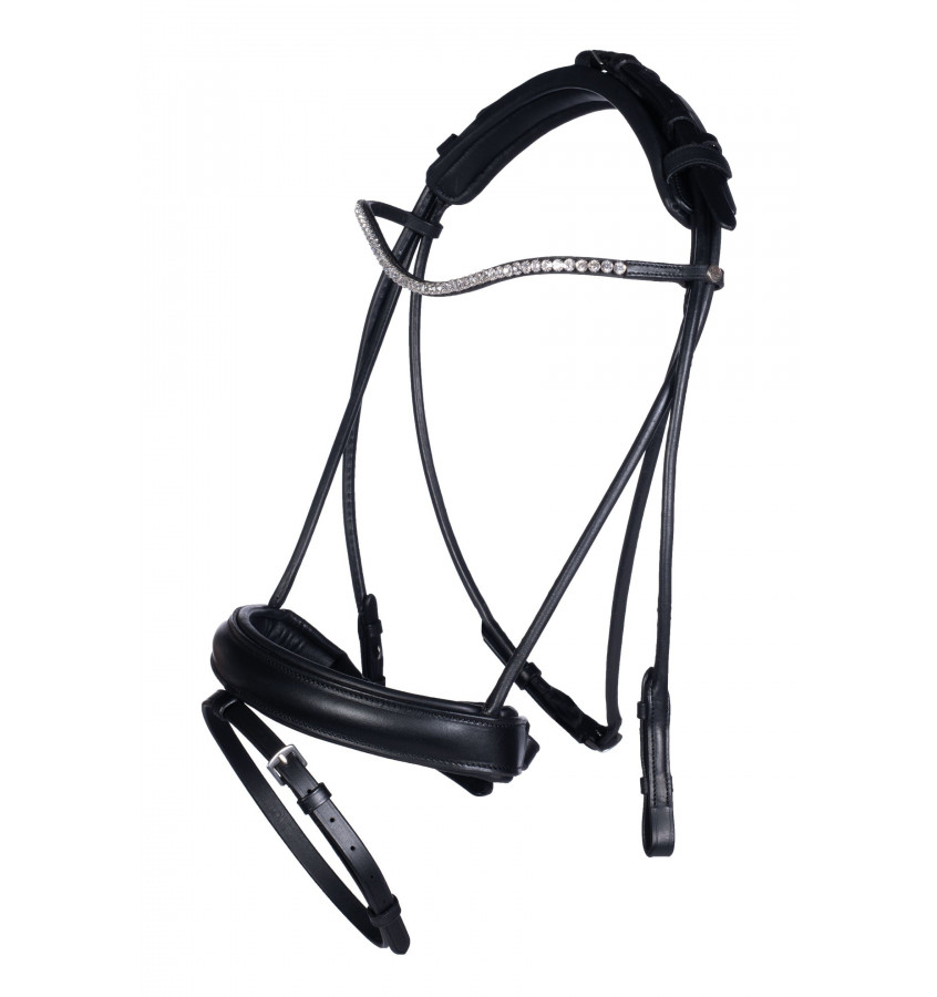 Ogłowie wykonane z wysokiej jakości skóry szyte na okrągło. Posiada nachrapnik szwedzki oraz naczółek zdobiony syntetycznymi diamencikami. Miękko podszyte w newralgicznych miejscach. W zestawie wodze parciane ze skórzanymi stoperami.