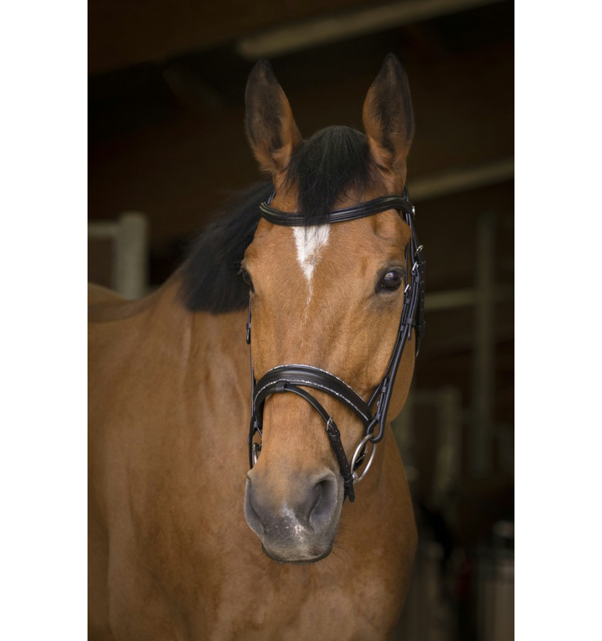 Wyjątkowe ogłowie wykonane z miękkiej bydlęcej skóry. Anatomiczny pasek potyliczny zmniejsza nacisk na newralgiczne miejsca. Nachrapnik zdobiony delikatnymi błyszczącymi kamyczkami. Sprzedawane bez wodzy.