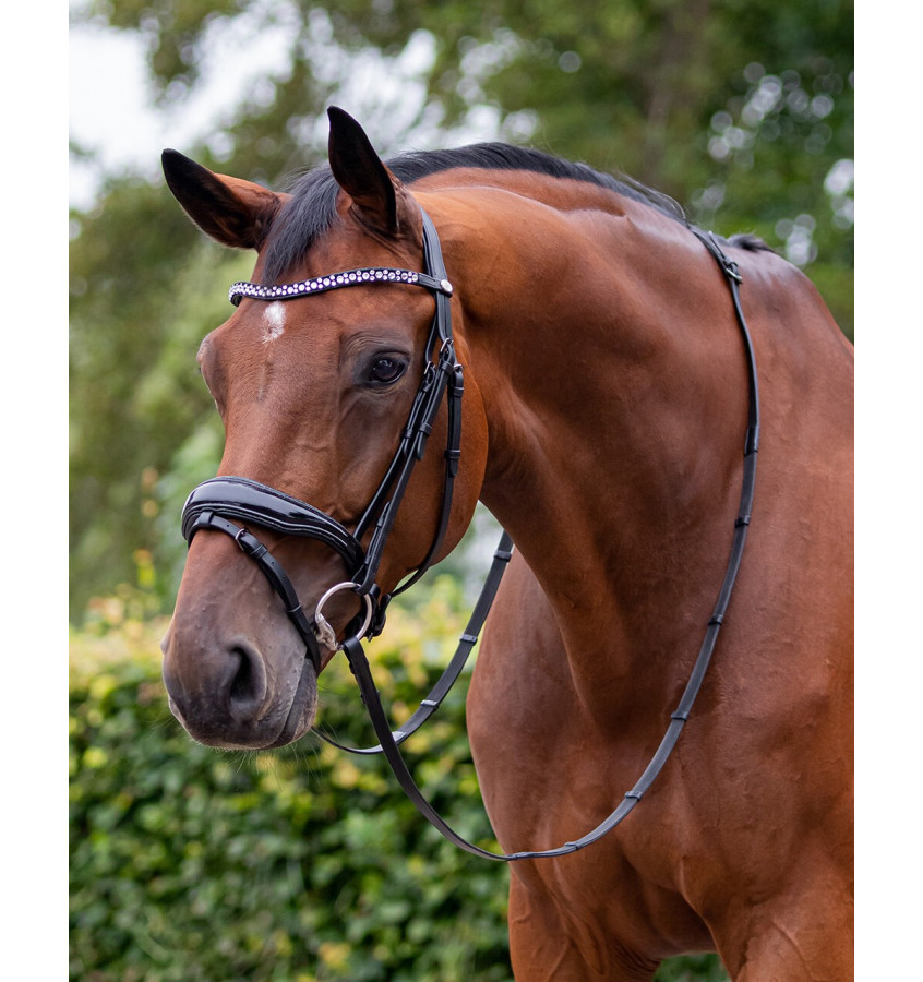 Eleganckie ogłowie ozdobione lakierowanym nachrapnikiem oraz naczółkiem pokrytym kryształkami, które pięknie się mienią. Dzięki anatomicznie ukształtowanemu nagłówkowi i nachrapnikowi z miękką wyściółką ogłowie jest bardzo wygodne w noszeniu. Błyszcząca obwódka wokół nachrapnika z lakierowanej skóry dopełnia eleganckiego wyglądu. W zestawie z wodzami.