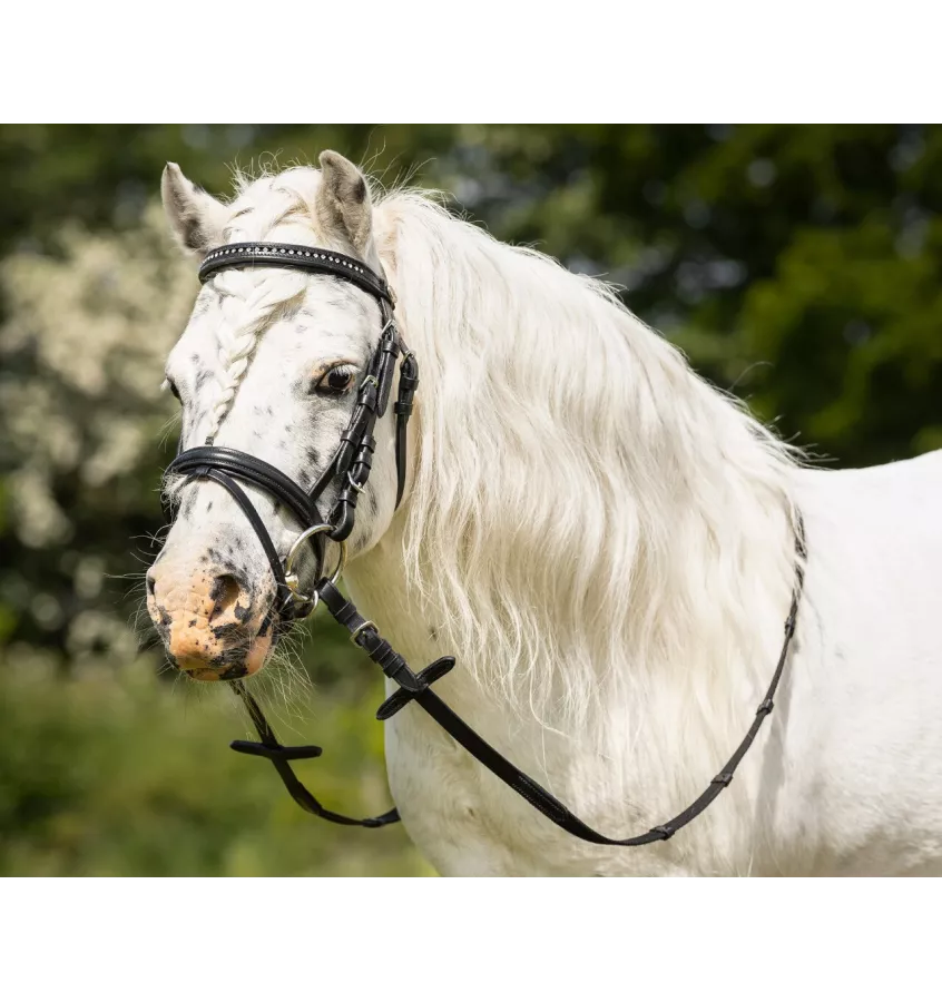 Skórzane ogłowia w małych rozmiarach dla szetlandów i małych kuców. Ogłowie ma piękny, lekko zakrzywiony naczółek z małymi kryształkami zapewniającymi subtelny wygląd. W zestawie z wodzami parcianymi.