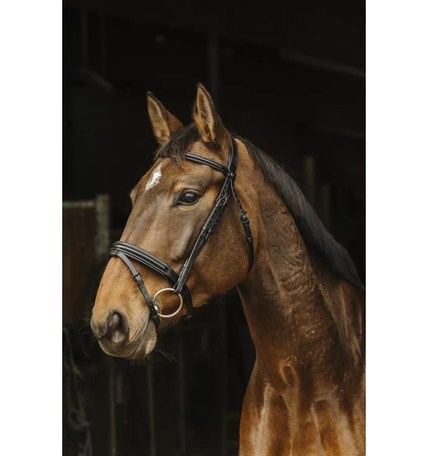 Ogłowie wykonane ze skóry bydlęcej. Miękko podszyte w newralgicznych miejscach. Paski policzkowe z możliwością regulacji miejsca, aby dopasować do głowy konia. Wędzidło mocowane na haczyki. Sprzedawane bez wodzy.