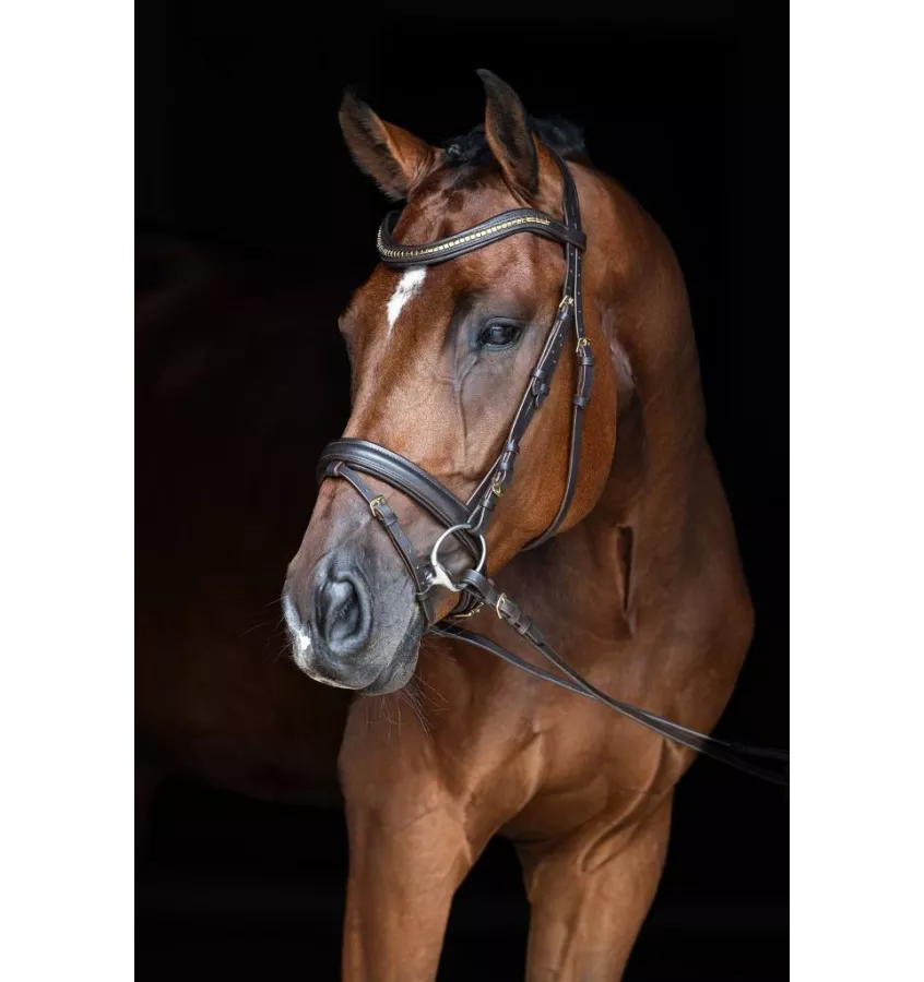 Ogłowie dla konia Clincher z nachrapnikiem w stylu angielskim Wykonane ze skóry, anatomicznie ukształtowane z miękką wyściółką. W komplecie z wodzami parcianymi. Z nierdzewnymi okuciami. Bez wędzidła.