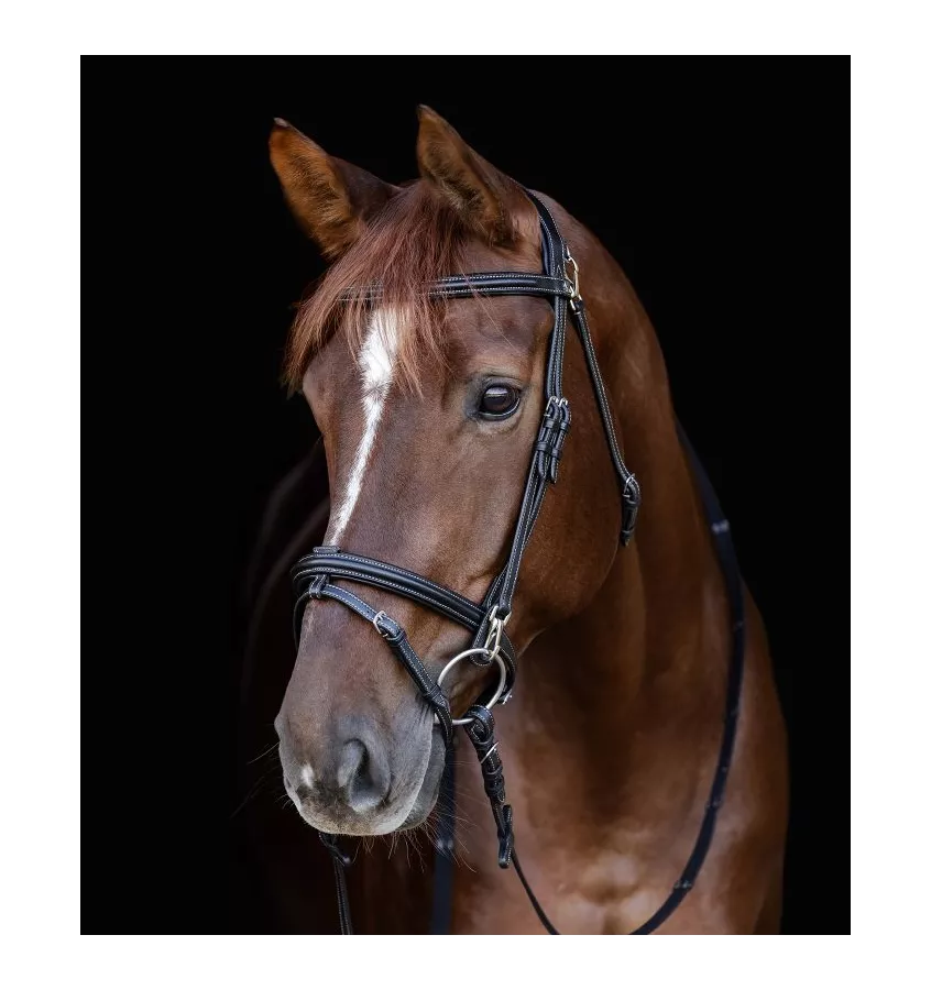 Ogłowie z angielskim nachrapnikiem kombinowanym. Anatomicznie ukształtowany nagłówek. Nachrapnik, naczółek i nagłówek z miękką wyściółką. Praktyczny klips na paskach policzkowych, co ułatwia wymianę wędzidła. Klipsy na pasku podgardlowym. Okucia ze stali nierdzewnej. Wodze parciane 19 mm w zestawie.