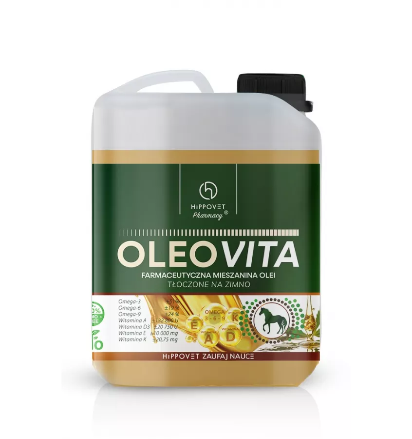 OLEOVITA to mieszanina oleju lnianego, konopnego i z kiełków kukurydzy dostarcza kwasów omega 3 oraz omega 6 w optymalnym stosunku, ponadto wzbogacona jest o dodatek witamin rozpuszczalnych w tłuszczach – A, D, E i K. Dopełnieniem formuły jest olejowy macerat z kminku i kopru włoskiego, które znane są z właściwości wspomagających trawienie.