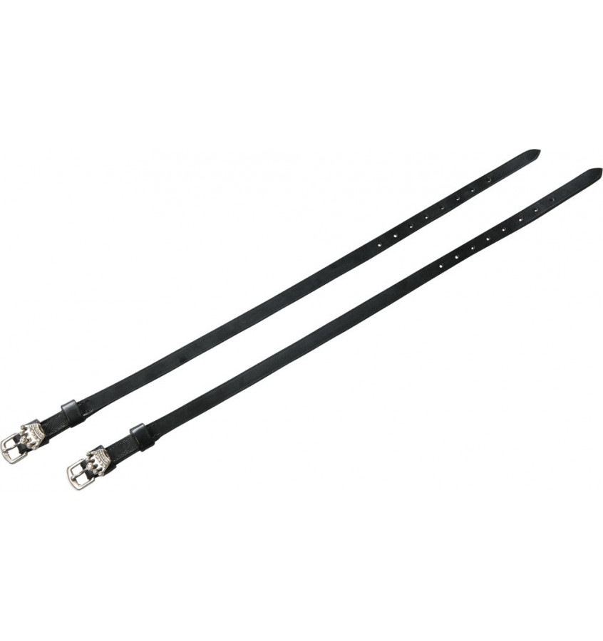 Skórzane paski do ostróg z ozdobną koroną przy sprzączce.