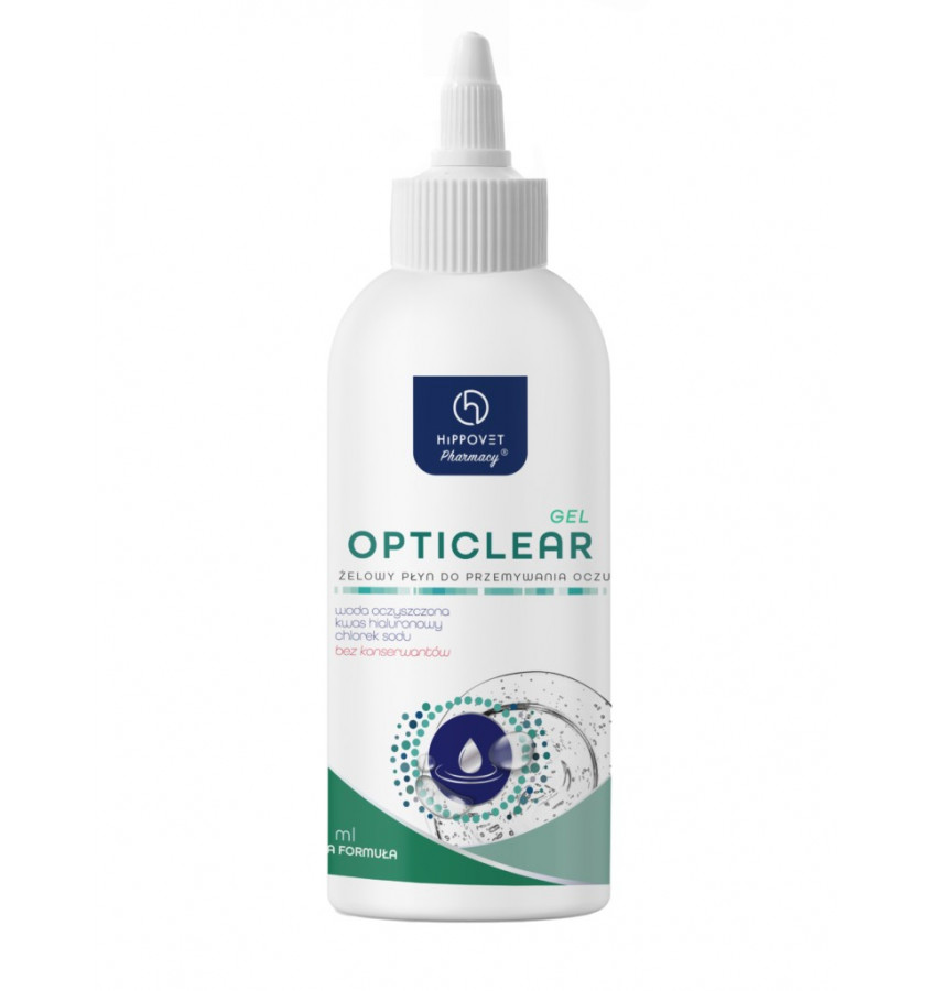 OptiClear GEL to preparat pielęgnacyjny, który skutecznie usuwa zanieczyszczenia i wydzieliny z okolic oczu. Dzięki wysokiej zawartości niskocząsteczkowego kwasu hialuronowego łagodzi podrażnienia spojówek oraz ułatwia naturalne nawilżenie oczu i powiek.Żelowa forma preparatu ułatwia aplikację na powieki zwierzęcia, dzięki czemu skutecznie usuwa zanieczyszczenia z okolicy podrażnionych oczu, działając przy tym nawilżająco oraz pielęgnacyjne.
