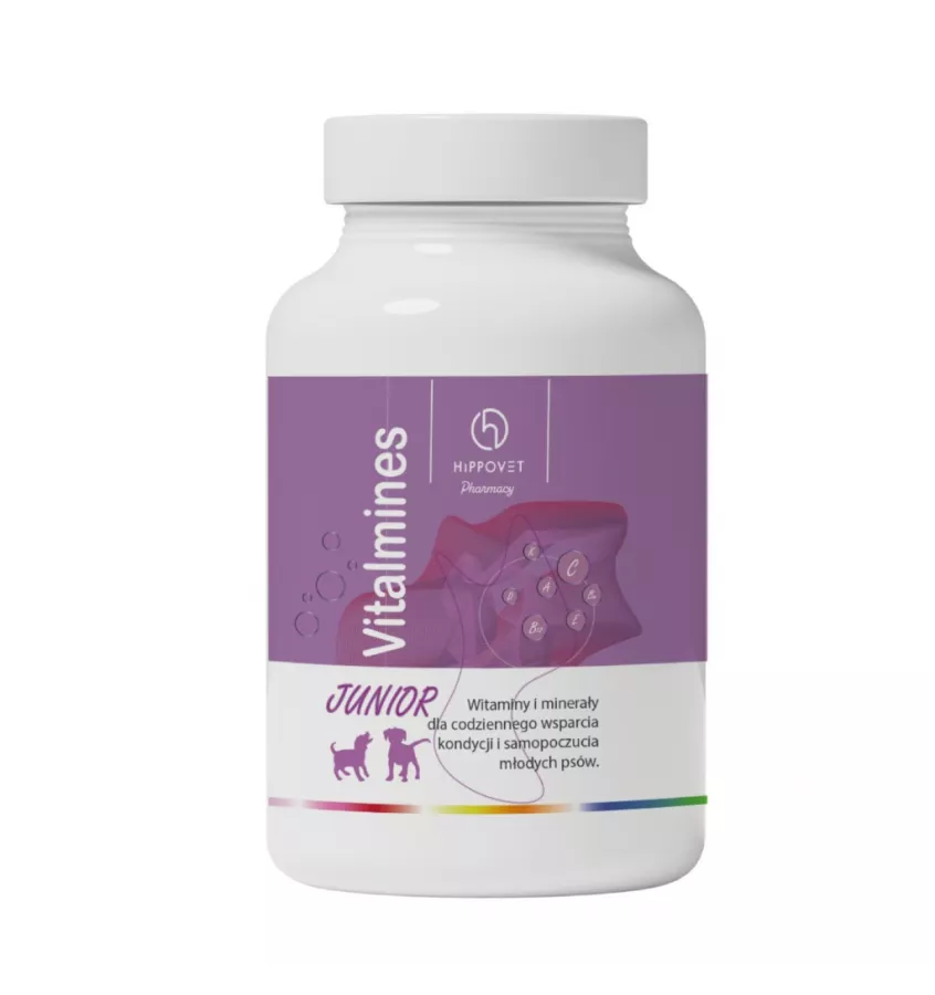 Vitalmines JUNIOR to innowacyjny kompleks witamin i biominerałów wspierających rozwój psów już od pierwszych miesięcy życia. Skutecznie zaspokaja dzienne zapotrzebowanie makro i mikroelementów gwarantując prawidłowy rozwój. Dzięki odpowiedniej zawartości naturalnych minerałów wspiera prawidłowy rozwój układu kostnego, stawów oraz układu odpornościowego.