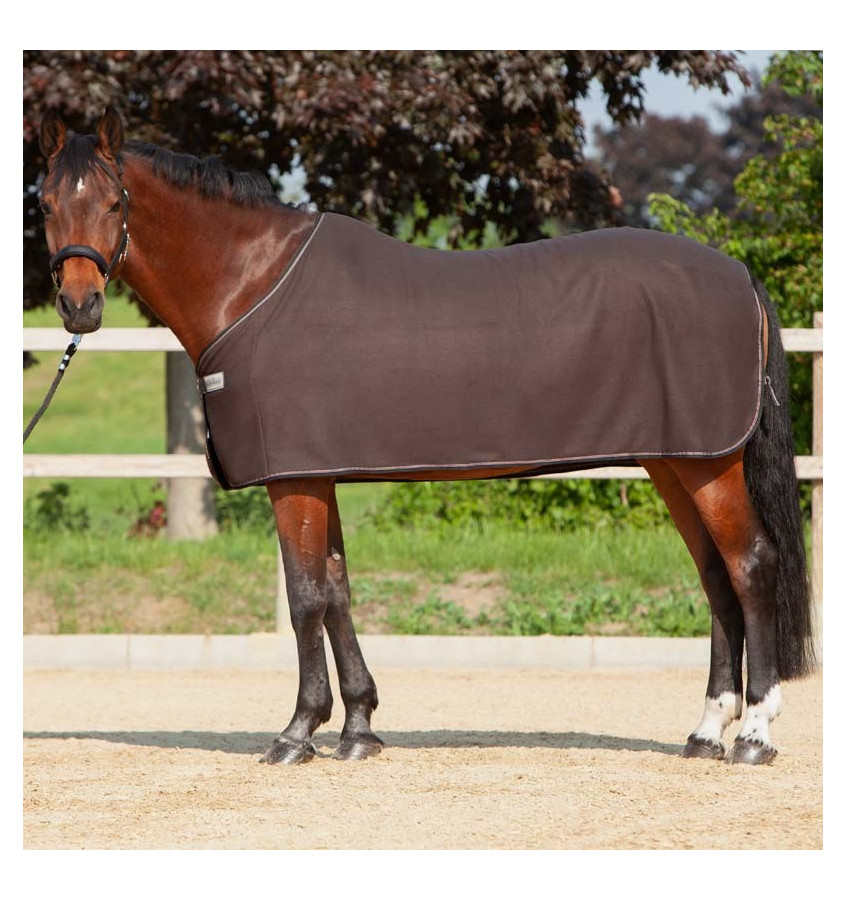 Derka polarowa wykonana z wysokiej jakości materiału. Derka ma za zadnie odprowadzać wilgoć z mokrego konia na zewnątrz. Wyposażona w zapięcie na piersi. Posiada jasną lamówkę.