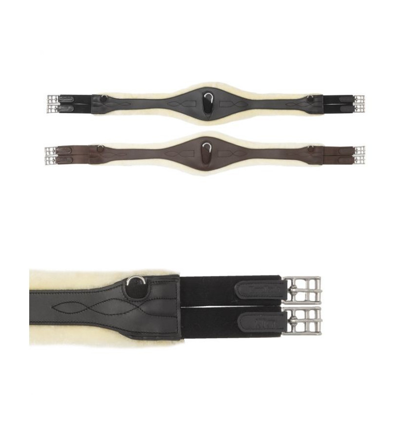 Popręg wykonany z najwyższej jakości skóry olejowanej. Podszyty miękkim sztucznym futerkiem, który zapinany jest na rzep, co daje możliwość wyprania. Wycięty anatomicznie w środkowej części. Wyposażony w gumy po obu stronach, co ułatwia podpinanie.