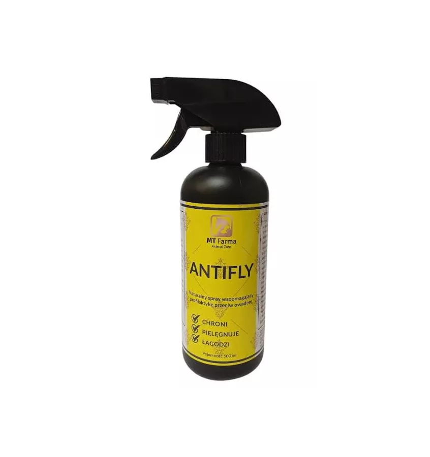 MT Farma Antifly to naturalny spray 2w1, oparty na mieszaninie ziołowych olejów i wody, który skutecznie maskuje naturalny zapach koński, zmniejszając uporczywość insektów i pasożytów zewnętrznych, takich jak muchy, meszki, komary, gzy, kleszcze i pchły. Dodatkowo pielęgnuje sierść oraz skórę konia, łagodząc skutki ukąszeń. Naturalny skład na bazie wody i olejków to duża zaleta, dzięki któremu preparat jest bezpieczny dla środowiska i może być używany codziennie.