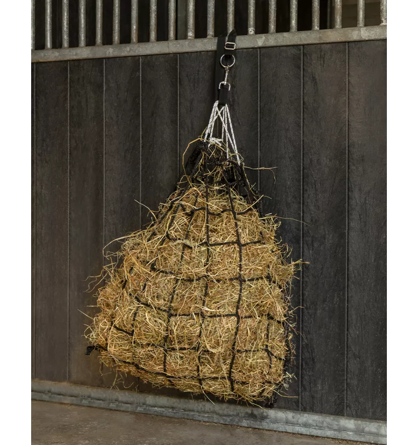 Siatka do siana Regular o oczkach 6 cm zapewnia szybkie pobieranie siana bez marnowania. Konstrukcja zapobiega rozsypywaniu i utrzymuje czystość w stajni lub na padoku. Nadaje się do zawieszania w różnych pozycjach. Całkowita waga z suchym sianem wynosi około 2,3 kg.