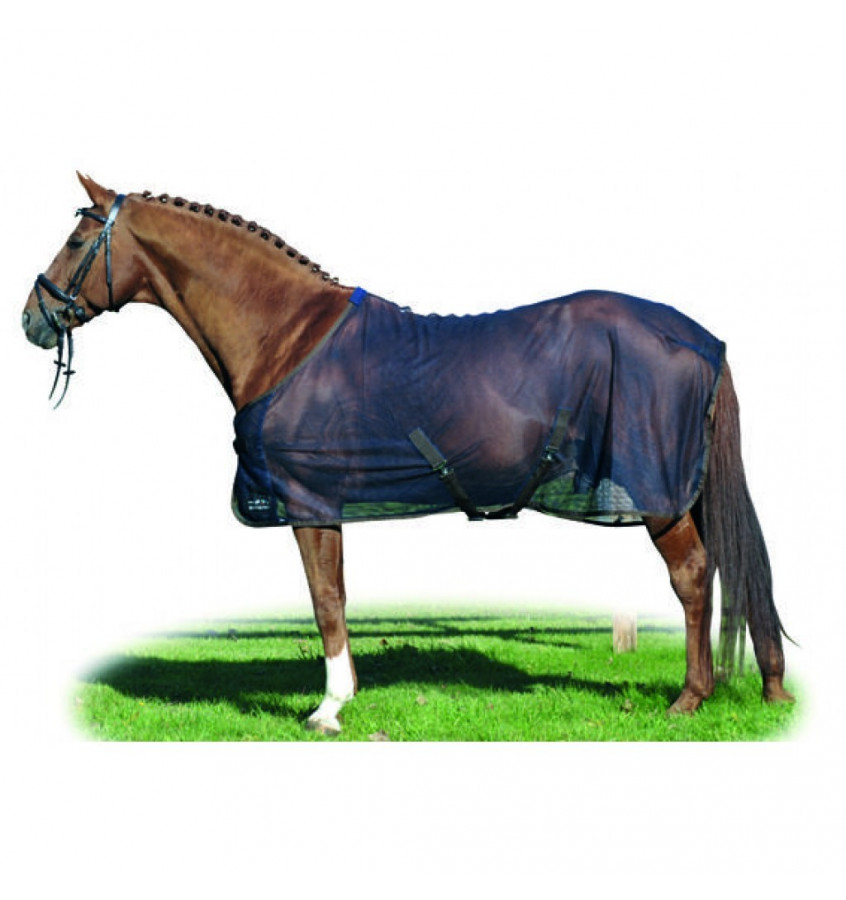 Derka siatkowa Santos wykonana z wysokiej jakości lekkiego, oddychającego materiału, odpornego na rozdarcia. Dzięki czemu koń czuje się w niej komfortowo. Chroni konia przed owadami. Rozcięcia na łopatkach zapewniają większą swobodę. Wyposażona w pasy krzyżowe pod brzuchem, klapę na ogon, sznurek pod ogon oraz podwójne zapięcie z przodu. Podszycie na kłębie zapobiega obtarciom. Prosta w pielęgnacji. Można prać w temp. 30 stopni oraz suszyć w suszarce.