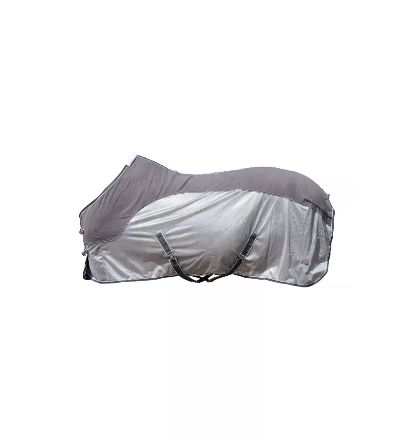 Derka, która świetnie sprawdzi się podczas cieplejszych wietrznych dni oraz jako derka transportowa. Grzbiet wykonano z materiału polarowego, który umożliwia osuszenie konia oraz ochronę wrażliwych miejsc przed wiatrem. Dół derki wykonano z mocnej siateczki, która jest przewiewna i chroni przed owadami. Wyposażona w odpinane pasy krzyżowe.
